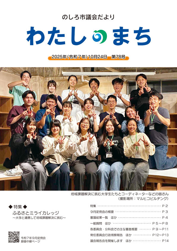 のしろ市議会だより(第78号) 令和7年10月24日発行(令和7年9月定例会) 関連ファイル P1 表紙 (PDF 787.00 KB) P2 特集 (PDF 661.00 KB) P3 9月定例会の概要 (PDF 617.00 KB) P4 審議結果一覧 ほか (PDF 644.00 KB) P5 一般質問(1) (PDF 644.00 KB) P6 一般質問(2) (PDF 644.00 KB) P7 一般質問(3) (PDF 644.00 KB) P8 一般質問(4) ほか (PDF 697.00 KB) P9 各委員会・分科会での主な審査概要(1) (PDF 665.00 KB) P10 各委員会・分科会で主な審査概要(2) (PDF 631.00 KB) P11 各委員会・分科会での主な審査概要(3) (PDF 633.00 KB) P12 各常任委員会行政視察報告 (PDF 709.00 KB) P13 各常任委員会行政視察報告(2) ほか (PDF 708.00 KB) P14 議会報告会を開催します ほか (PDF 692.00 KB) 一括ダウンロード (PDF 1.96 MB)