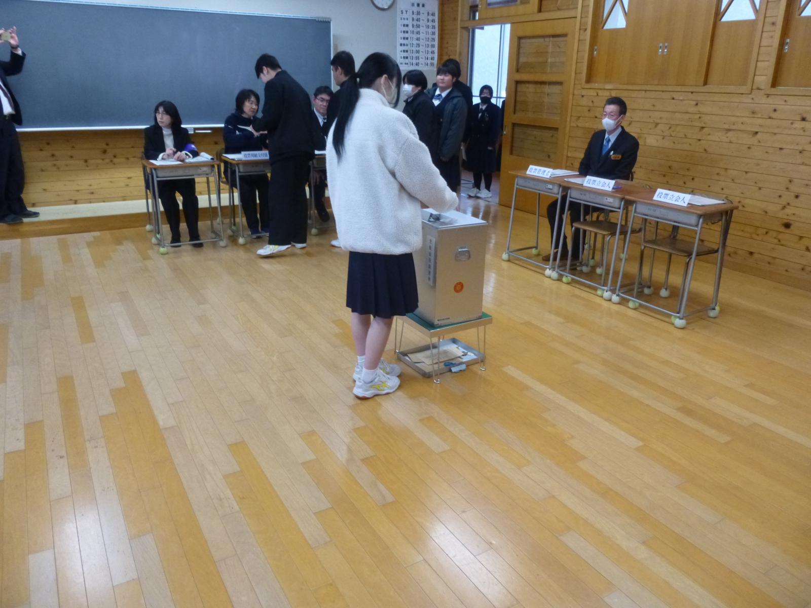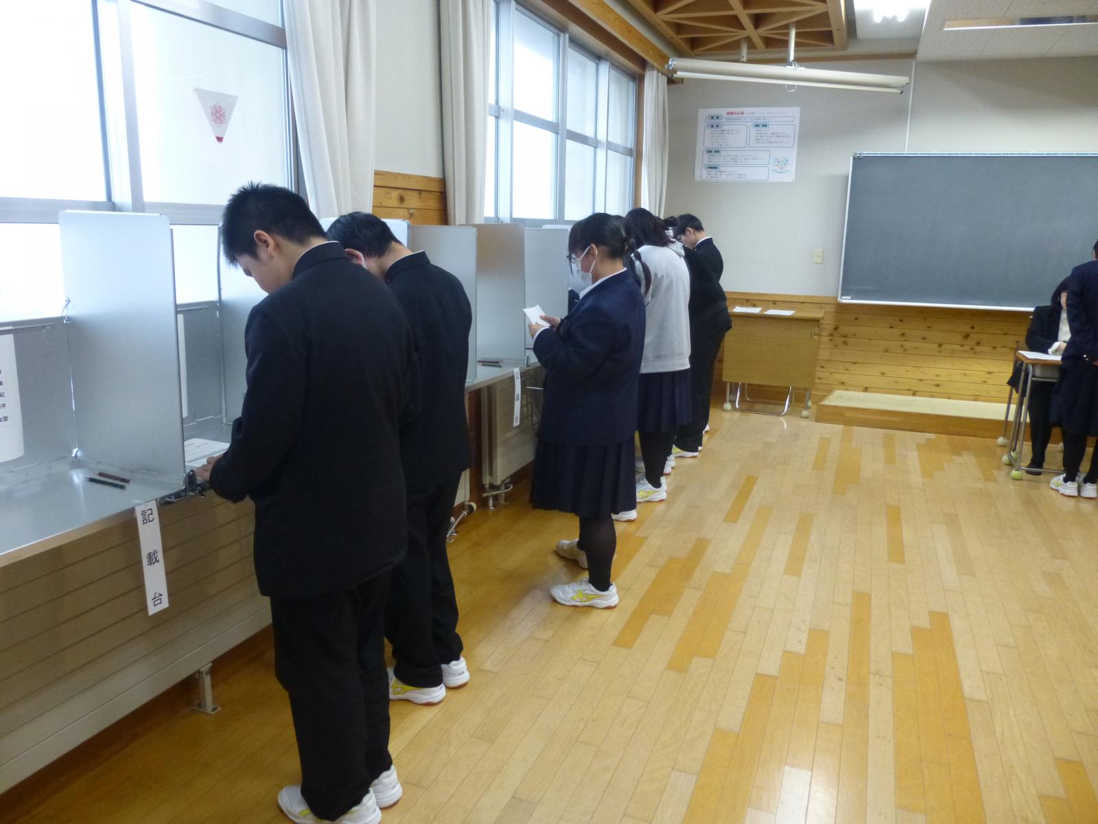 参加した生徒のみなさんは、政治や選挙に関する講座や候補者の演説を聞いた後、受付をして投票用紙を受け取り、投票するといった実際の投票所内での流れを体験しました。
