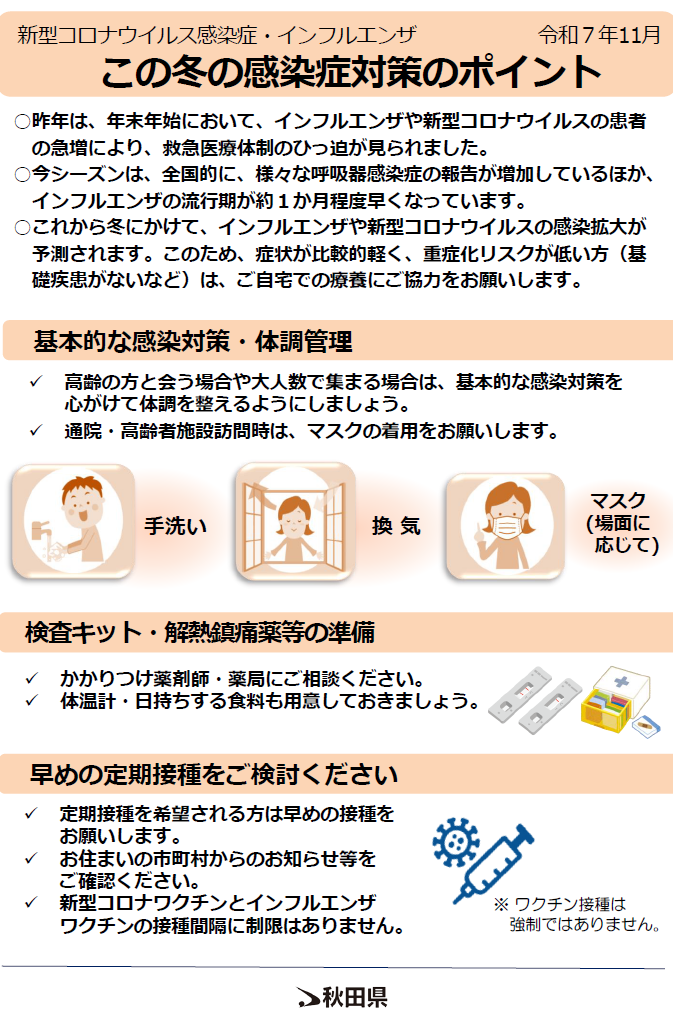 この冬の感染対策について 全国的に冬期に流行する感染症について、秋田県でも予断を許さない状況が続いています。 今シーズンは、特にインフルエンザの流行期が例年より1か月程度早くなっています。さらに、マイコプラズマ肺炎を初めとするその他の呼吸器感染症の増加や新型コロナウイルス感染症の集団発生が依然として多く報告されている状況です。 重症化リスクの高い方々が適切な医療を受けられるよう、手洗いや換気、場面に応じたマスクの着用等の感染対策の徹底をお願いいたします。
