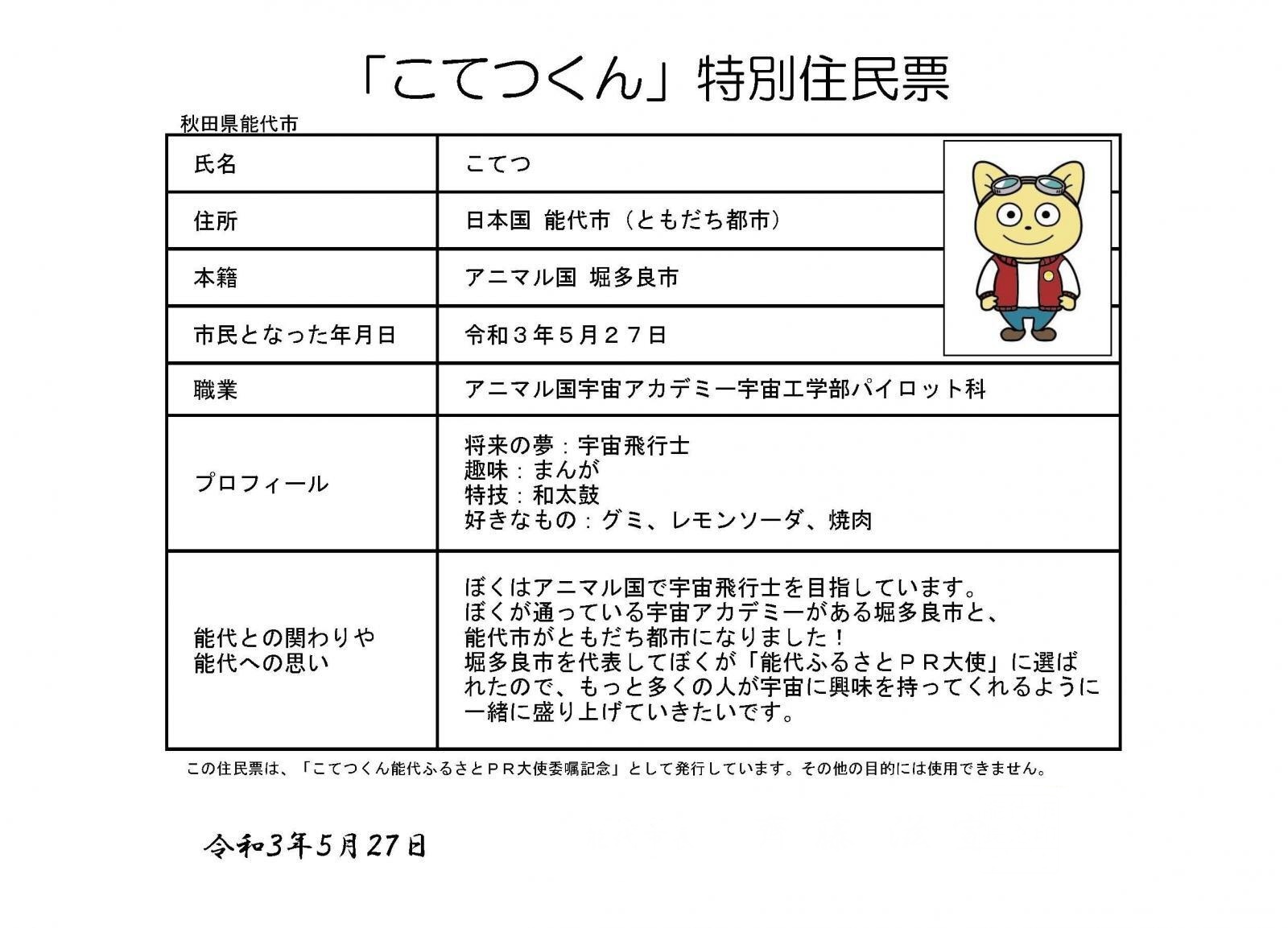 また、こてつくんの能代ふるさとPR大使委嘱記念として、能代市の特別住民票を発行しました。