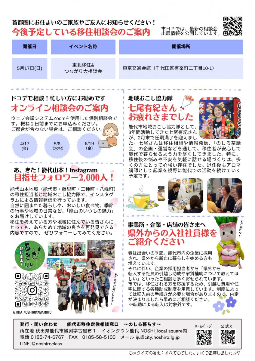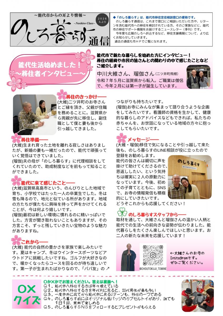 のしろ暮らす通信を発行しました 「のしろ暮らす通信」は、これまで能代市移住定住相談窓口にご相談いただいた方や、 Aターン・移住定住登録されている方を中心に、能代市の移住サポート情報などを お届けする季刊のニュースレターです 。 最新号2026年3月25日号 関連ファイルからご覧いただけます。 ※令和4年4月25日号から、「広報のしろ」にも折込し、市内の皆さまにも配布しています。 ※ホームページ掲載データは最新の情報に修正している場合があります。 関連コンテンツ 移住・定住 能代市移住定住支援ページ 関連ファイル のしろ暮らす通信2026年3月25日号 (PDF 3.87 MB) のしろ暮らす通信2025年7月25日号 (PDF 6.75 MB) のしろ暮らす通信2024年12月25号 (PDF 3.17 MB) のしろ暮らす通信2024年11月1号 (PDF 3.20 MB) のしろ暮らす通信2024年7月25日号 (PDF 2.96 MB) のしろ暮らす通信2024年3月25日号 (PDF 5.38 MB) のしろ暮らす通信2023年12月25日号 (PDF 811.00 KB) のしろ暮らす通信2023年8月10日号 (PDF 3.66 MB) のしろ暮らす通信2023年5月10日号 (PDF 29.09 MB) のしろ暮らす通信2023年2月25日号 (PDF 3.30 MB) のしろ暮らす通信2022年末号 (PDF 465.00 KB) のしろ暮らす通信2022年10月25日号 (PDF 527.00 KB) のしろ暮らす通信2022年8月10日号 (PDF 4.17 MB) のしろ暮らす通信2022年4月25日号 (PDF 689.00 KB) のしろ暮らす通信2021冬 (PDF 2.13 MB) のしろ暮らす通信 2022年1月1日 (PDF 2.82 MB) のしろ暮らす通信2021秋 (PDF 819.00 KB) のしろ暮らす通信2021夏 (PDF 843.00 KB) のしろ暮らす通信2021春 (PDF 1.96 MB)