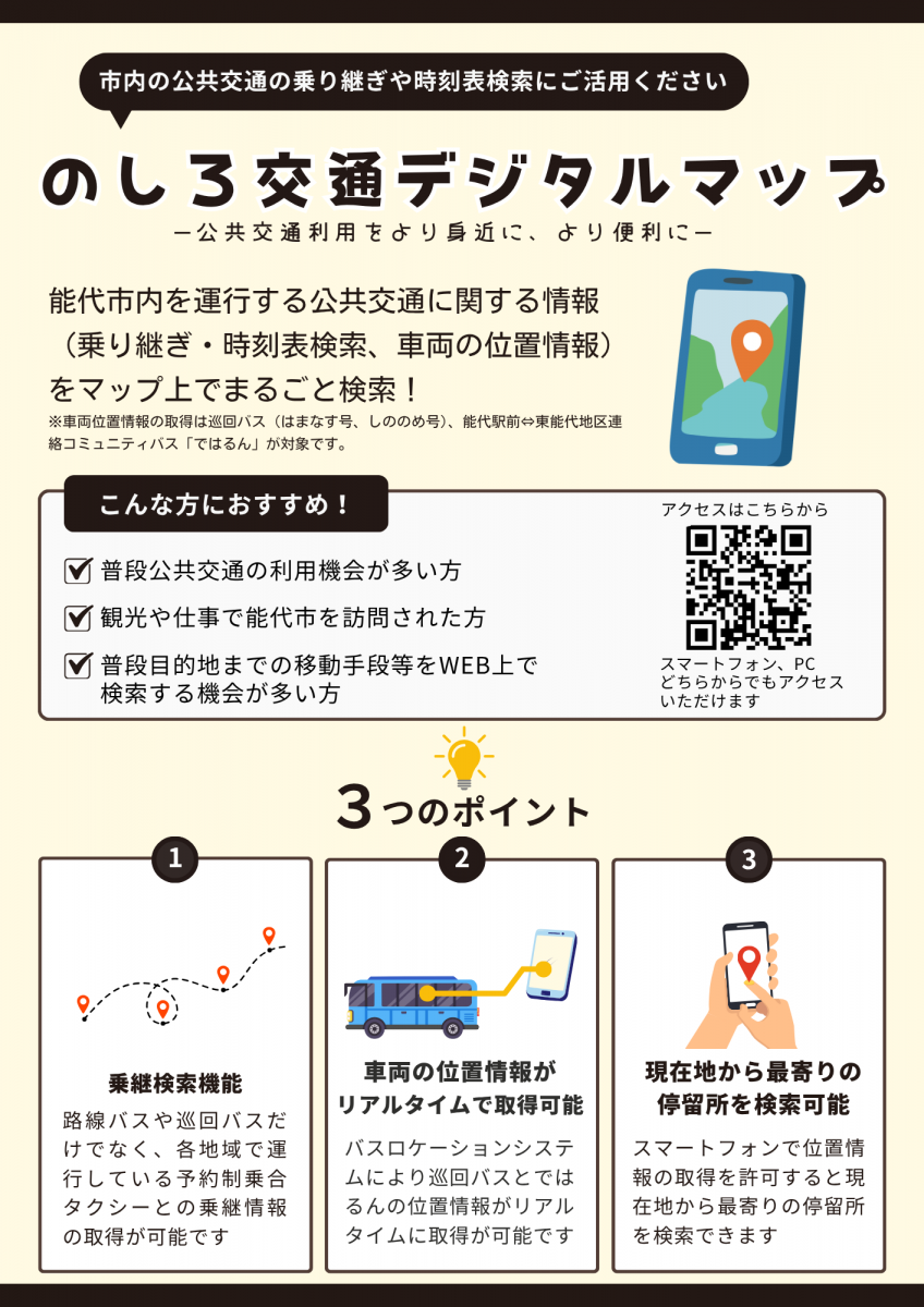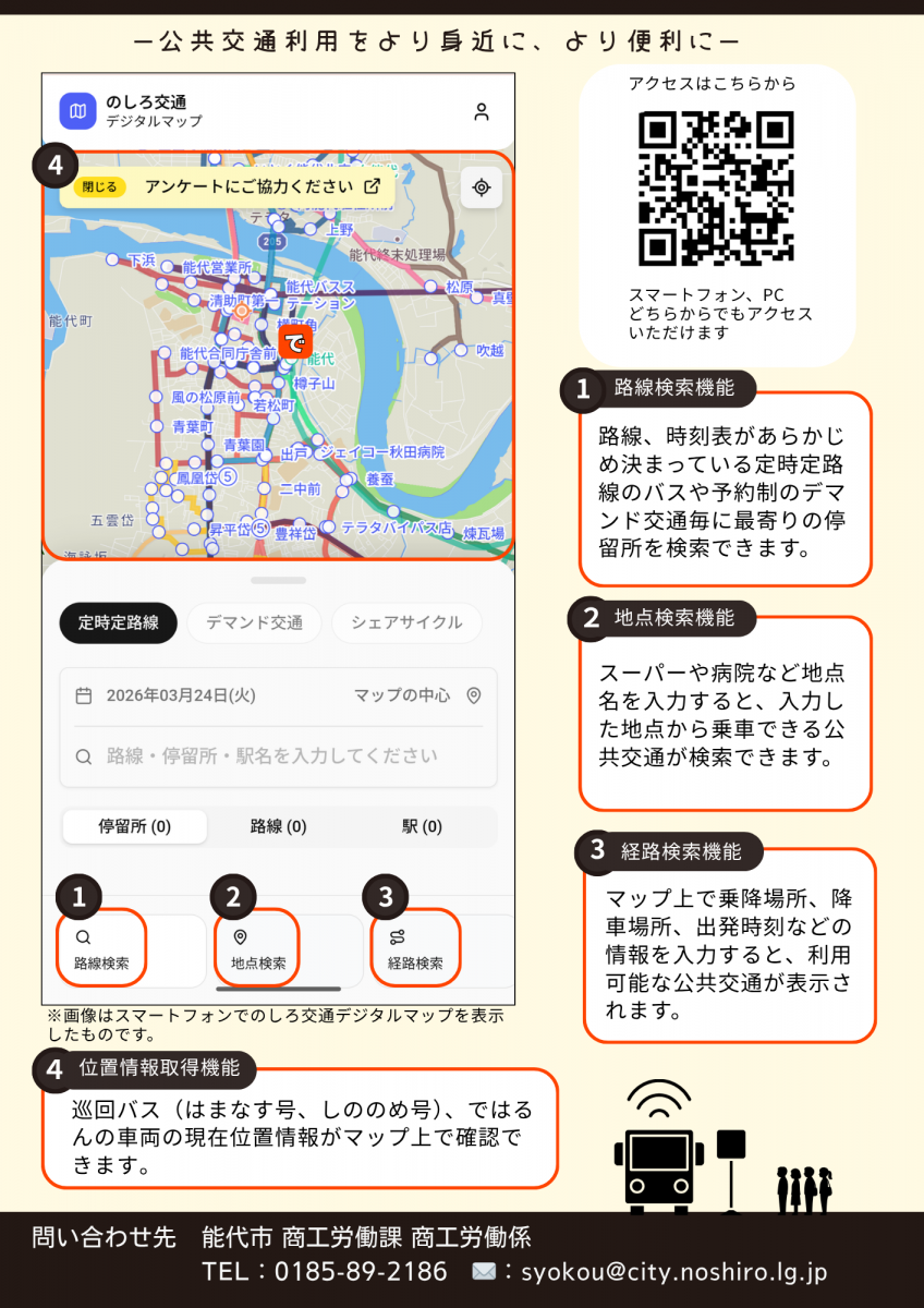 能代市内を運行する公共交通に関する情報(乗り継ぎ・時刻表検索、車両の位置情報等)をインターネット上のマップで検索できる「のしろ交通デジタルマップ」を公開します。