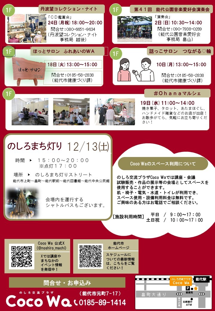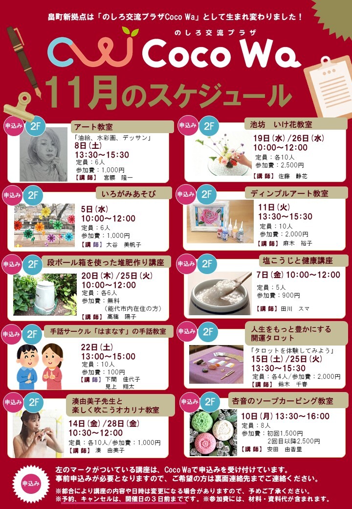 のしろ交流プラザCoco Wa11月のスケジュール 11月にのしろ交流プラザCoco Waで行われる講座、催しなどのスケジュール一覧になります。 講座は事前申し込みが必要となりますので、ご希望の方はのしろ交流プラザCoco Wa(0185-89-1414)までご連絡ください。 ※講師へ直接の申し込みとなる場合がございます。詳細はチラシをご確認ください。 関連リンク のしろ交流プラザCoco WaのX(Twitter) 関連ファイル 11月のスケジュールチラシ (PDF 822.00 KB) Coco Wa駐車場案内 (PDF 141.00 KB) 関連マップ のしろ交流プラザCoco Wa(中心市街地活性化室)の場所