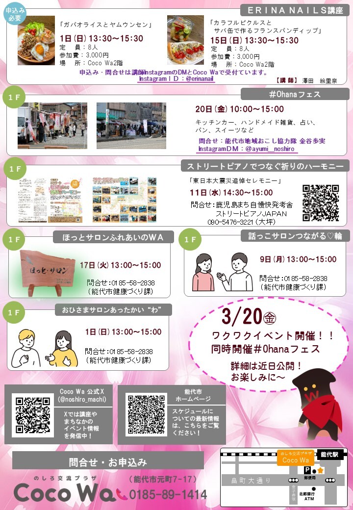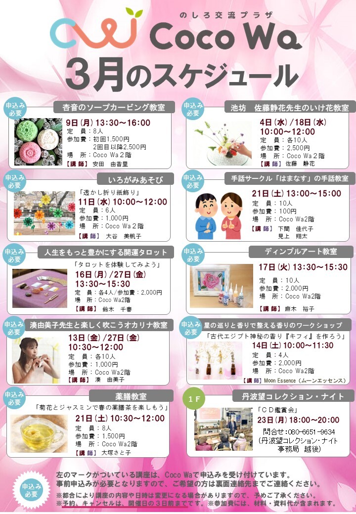 のしろ交流プラザCoco Wa3月のスケジュール 3月にのしろ交流プラザCoco Waで行われる講座、催しなどのスケジュール一覧になります。 講座は事前申し込みが必要となりますので、ご希望の方はのしろ交流プラザCoco Wa(0185-89-1414)までご連絡ください。 ※講師へ直接の申し込みとなる場合がございます。詳細はチラシをご確認ください。 関連リンク のしろ交流プラザCoco WaのX(Twitter) 関連ファイル 3月のスケジュールチラシ (PDF 752.00 KB) Coco Wa駐車場案内 (PDF 141.00 KB) 関連マップ のしろ交流プラザCoco Wa(中心市街地活性化室)の場所