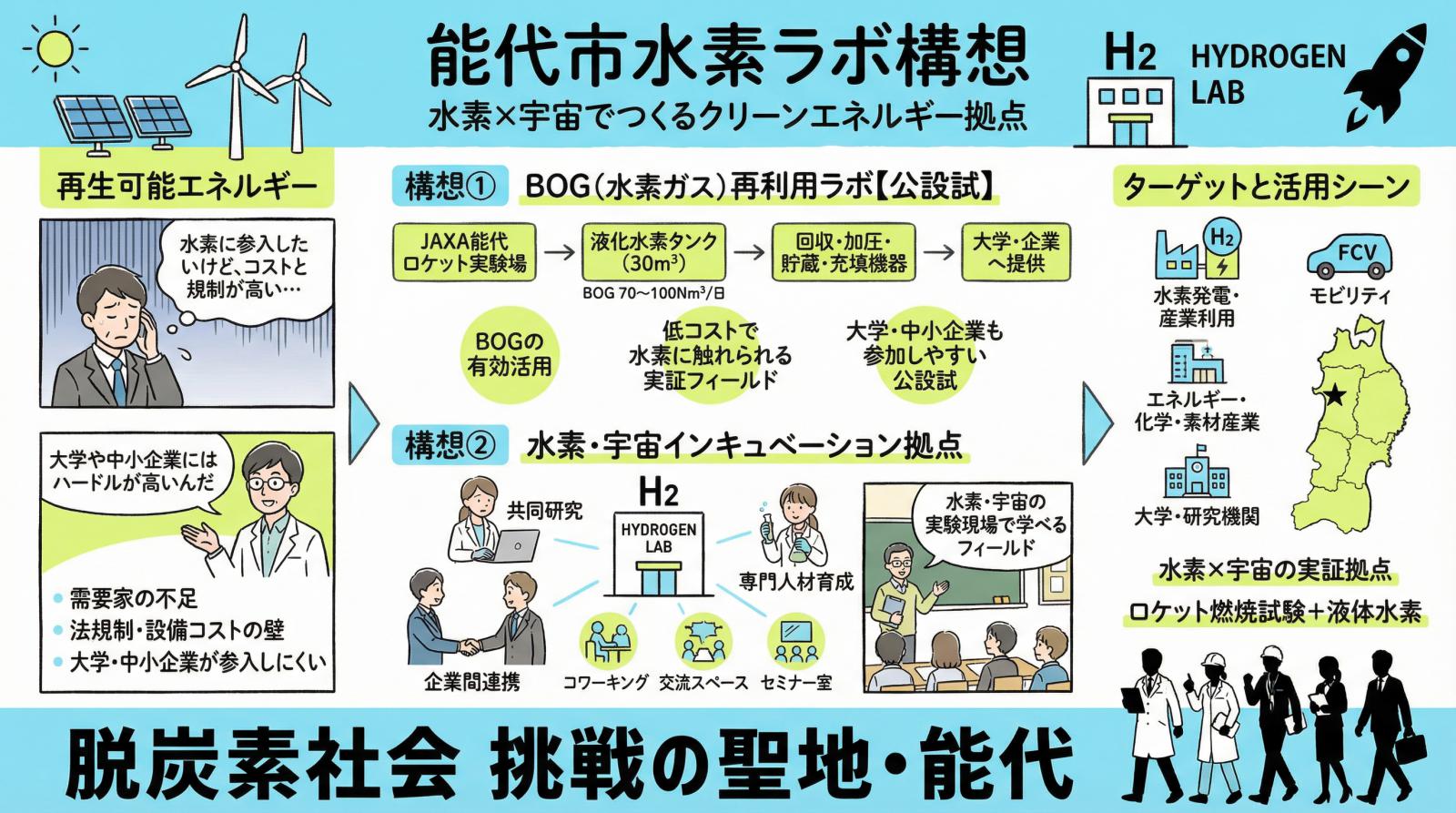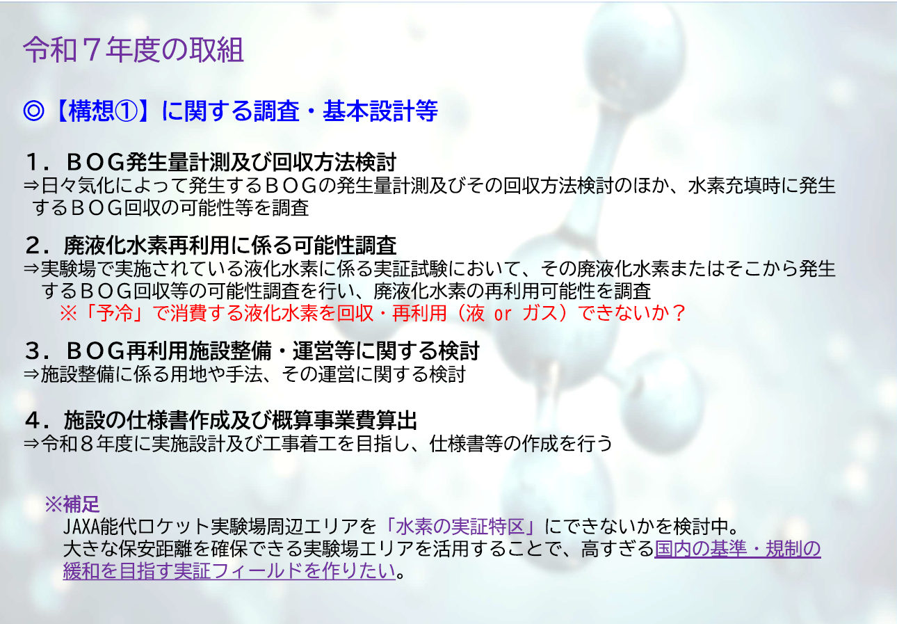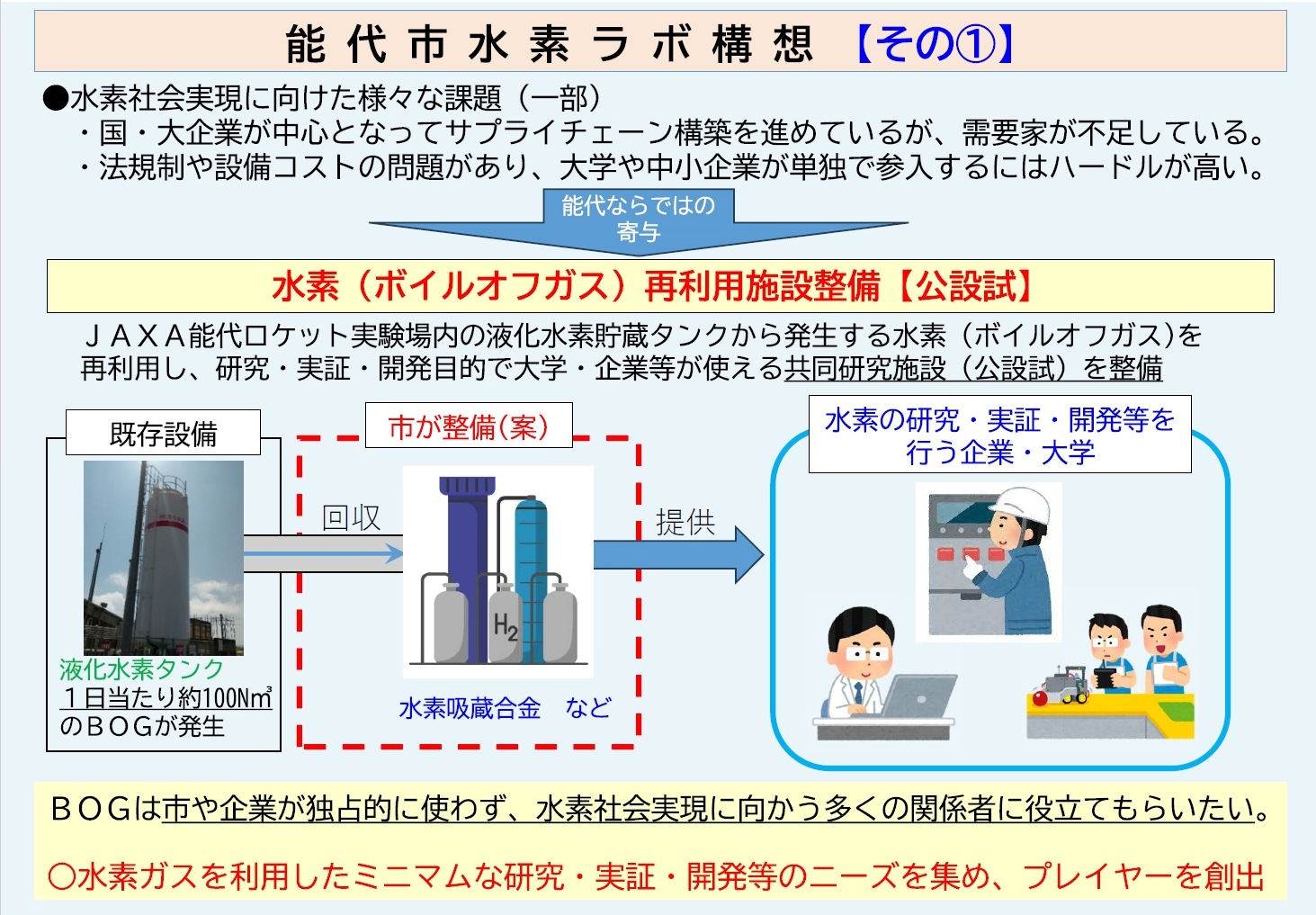 市とJAXAが連携して、JAXA能代ロケット実験場内にある液化水素貯蔵タンクから発生するボイルオフガスを回収・再利用し、水素関連ベンチャー企業等へ提供する【構想1】と、その後、こうした企業や大学等が集まり水素関連の技術検証や製品開発、研究等を行うことが出来るラボを整備する【構想2】があります。