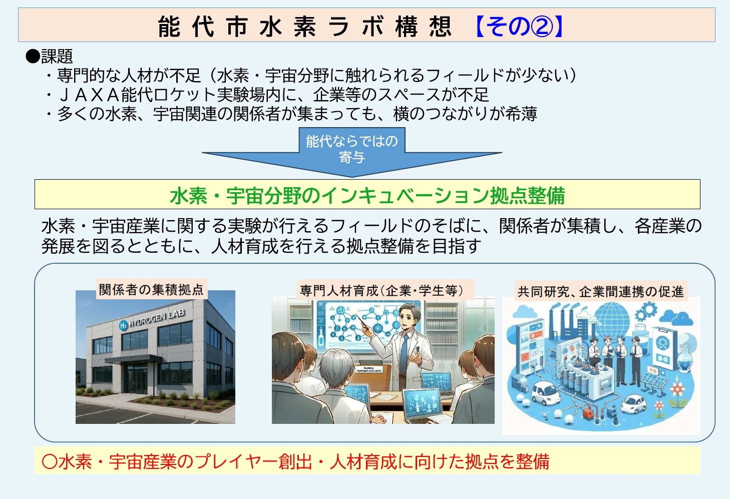 水素関連の開発・実証を行う企業や学生が集まることができるラボを建設(民間資金等の活用を想定)し、関係人口の創出や、JAXAや大学と連携して水素に関する専門教育を施し、人材育成の場を創ることを目指します