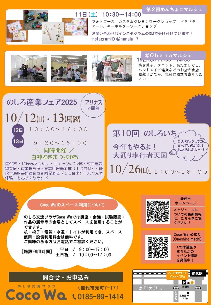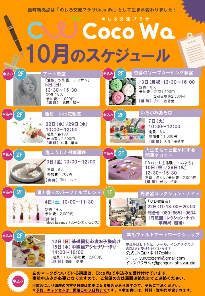 のしろ交流プラザCoco Wa10月のスケジュール 10月にのしろ交流プラザCoco Waで行われる講座、催しなどのスケジュール一覧になります。 講座は事前申し込みが必要となりますので、ご希望の方はのしろ交流プラザCoco Wa(0185-89-1414)までご連絡ください。 ※講師へ直接の申し込みとなる場合がございます。詳細はチラシをご確認ください。 関連リンク のしろ交流プラザCoco WaのX(Twitter) 関連ファイル 10月のスケジュールチラシ (PDF 998.00 KB) Coco Wa駐車場案内 (PDF 141.00 KB) 関連マップ のしろ交流プラザCoco Wa(中心市街地活性化室)の場所