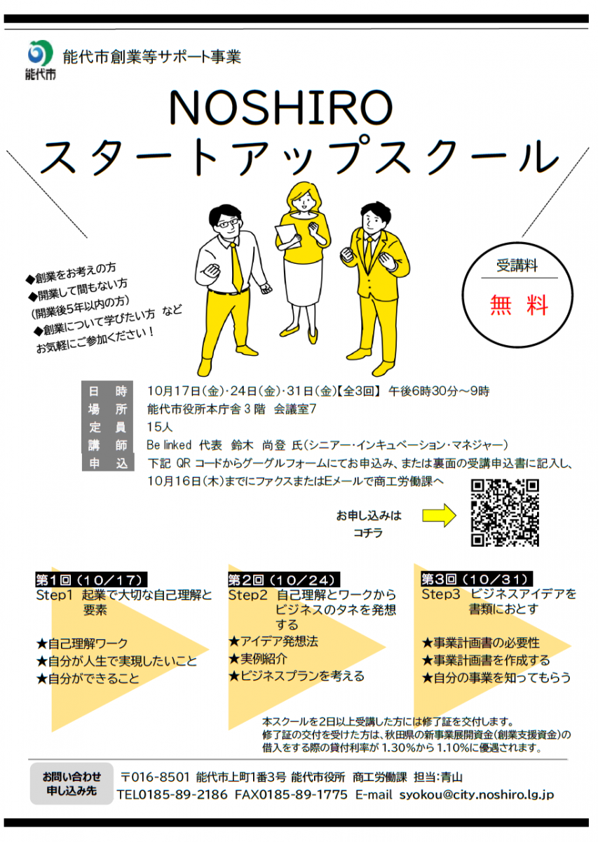 申し込み | こちらもしくは下記リンクから専用フォームにてお申込みいただくか、チラシ裏面の受講申込書に記入し、10月16日(木曜日)までに商工労働課宛ファクスまたはEメールでご送付ください。 https://forms.gle/jMKtgHE9Au6Buabt8 |