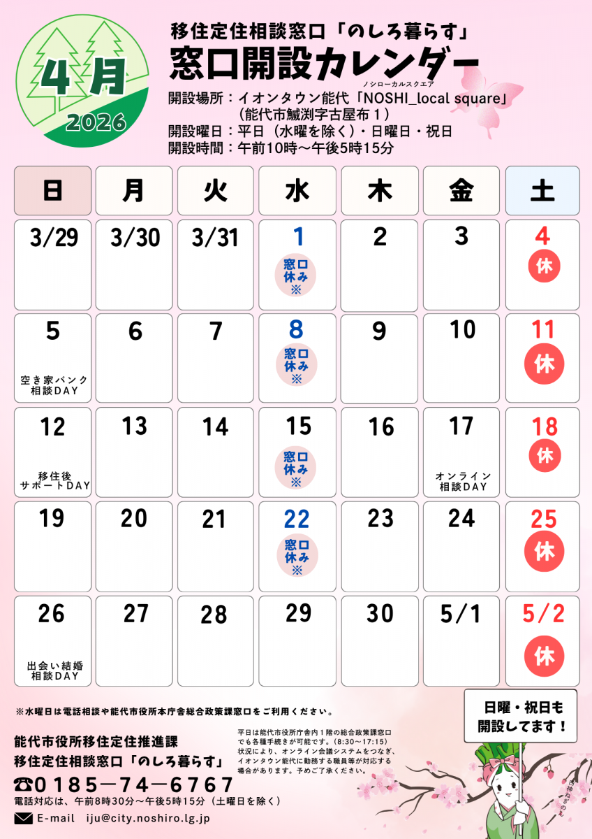 移住定住推進課は、イオンタウン能代内のNOSHI_local square(ノシローカルスクエア)にあります。能代市移住定住相談窓口「のしろ暮らす」のメイン窓口も同所で業務を行っていますので、ご利用ください!