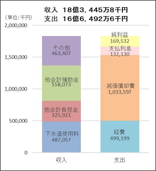 汚水と雨水を処理する費用とその財源です。主な収入は下水道使用料と一般会計からの繰入金です。