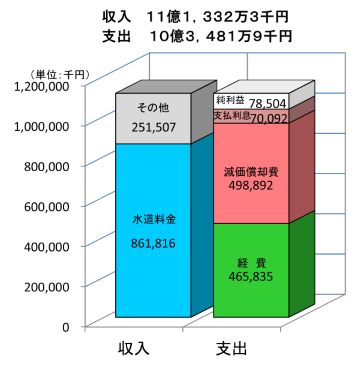 水道水を作り、各家庭や事業所へ給水するまでの費用とその財源です。主な収入は水道料金です。